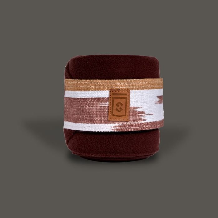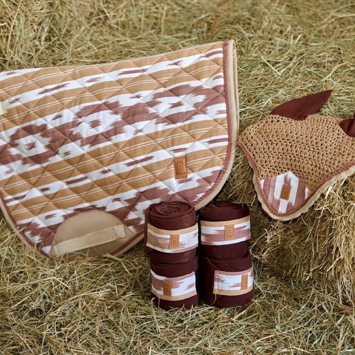 Equestrian polo wraps in earth tones with Mallorcan Ikat detail.