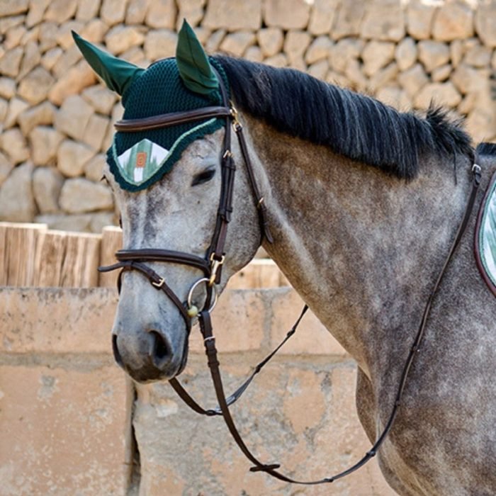 The Deià ear bonnet forms part of the textile collection inspired by the traditional llengües mallorquines, reinterpreted for the equestrian world.