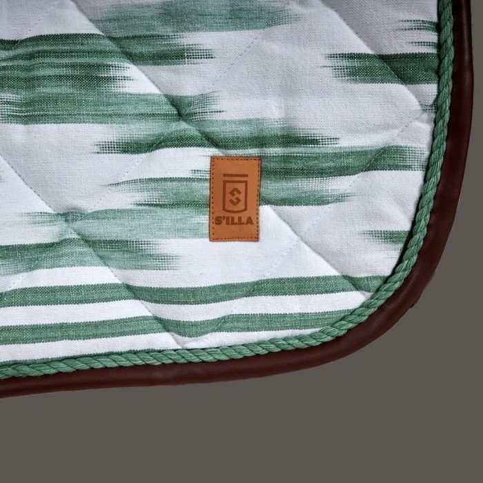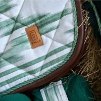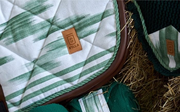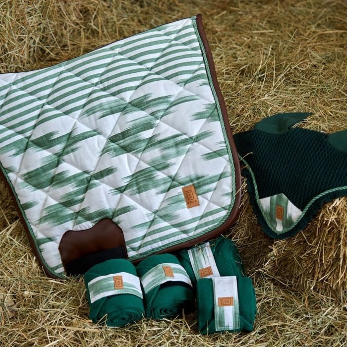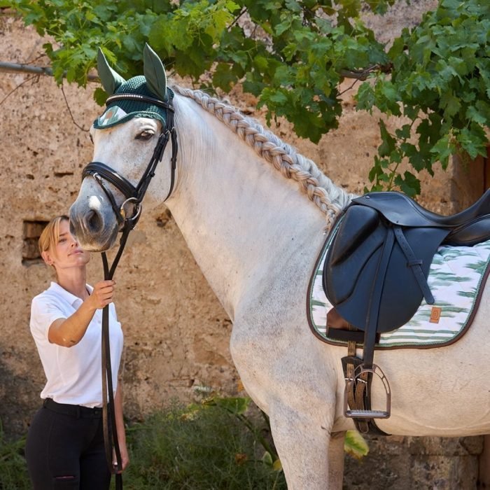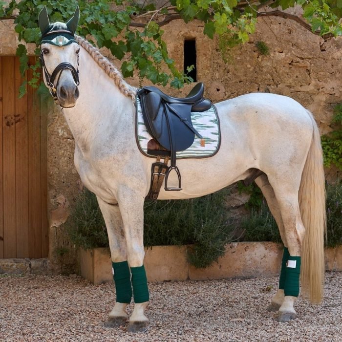 The Deià dressage saddle pad, in green with brown leather details, is a piece inspired by Mallorca’s textile heritage and the traditional art of llengües mallorquines, reinterpreted for the equestrian world.
