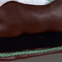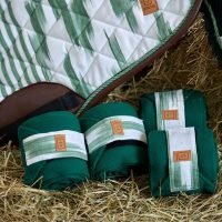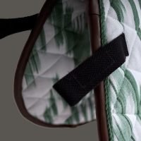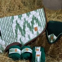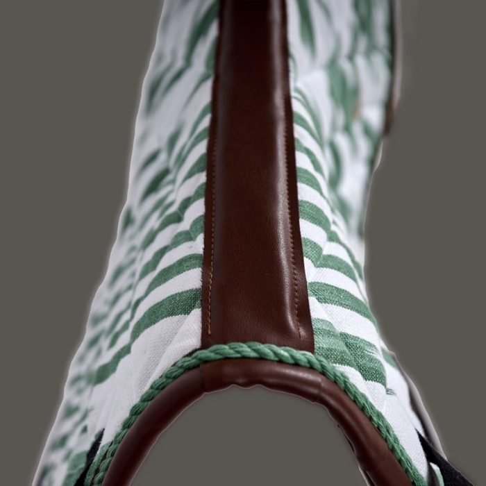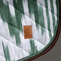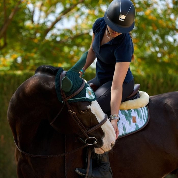 The Deià jumping saddle pad, in green with brown leather details, is inspired by Mallorca’s textile heritage and the traditional art of llengües mallorquines, reinterpreted for the equestrian world.
