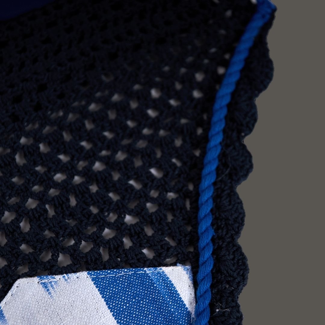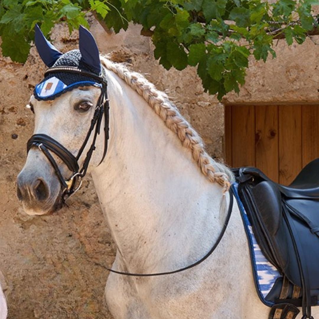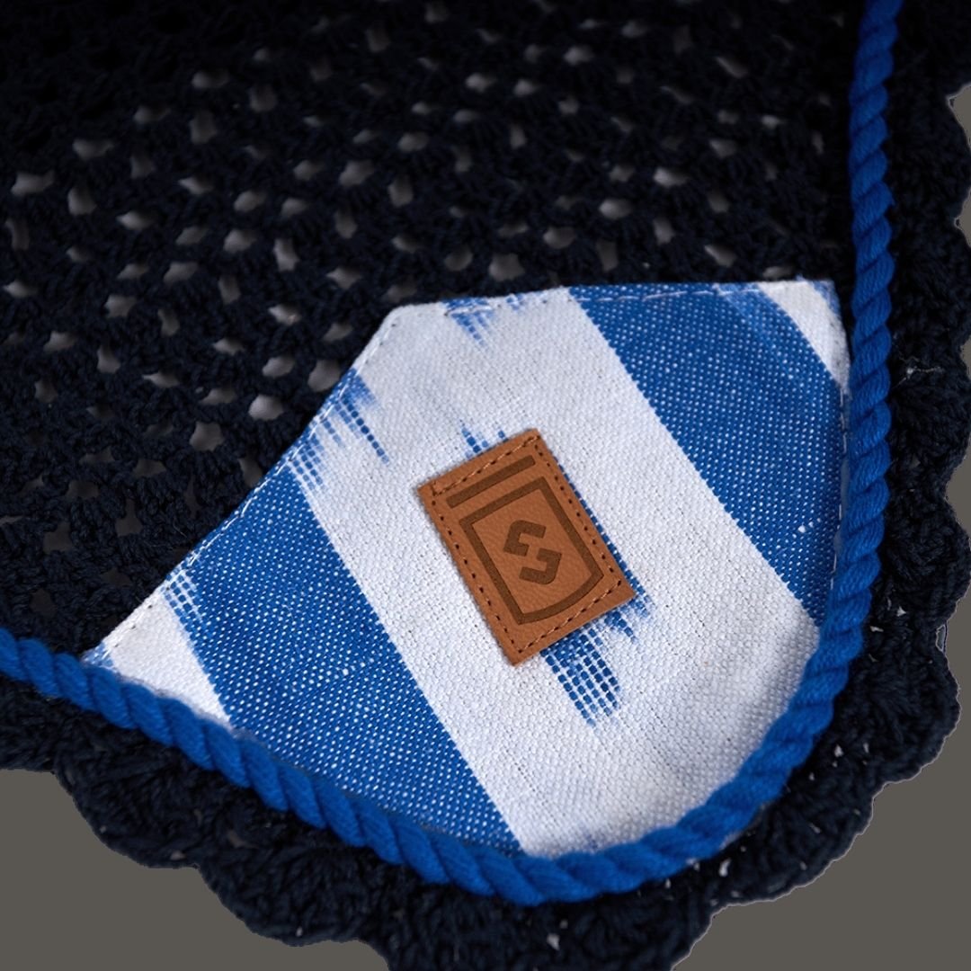 Orejeras Deià en color azul, confeccionadas en algodón con orejas de tejido suave y elástico para un ajuste cómodo. Detalles en tela mallorquina Ikat y piel vegana aportan un toque artesanal y sostenible.
