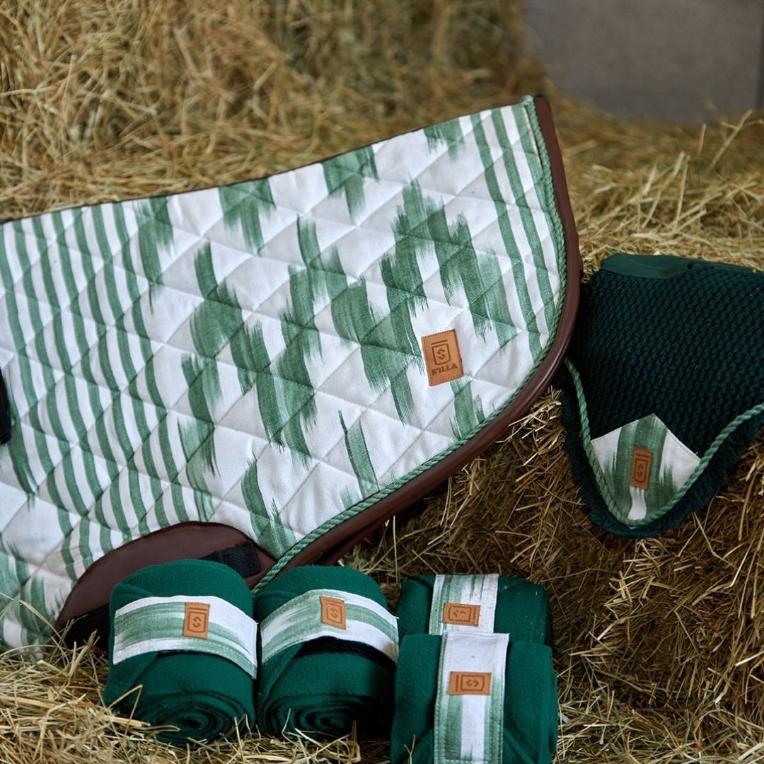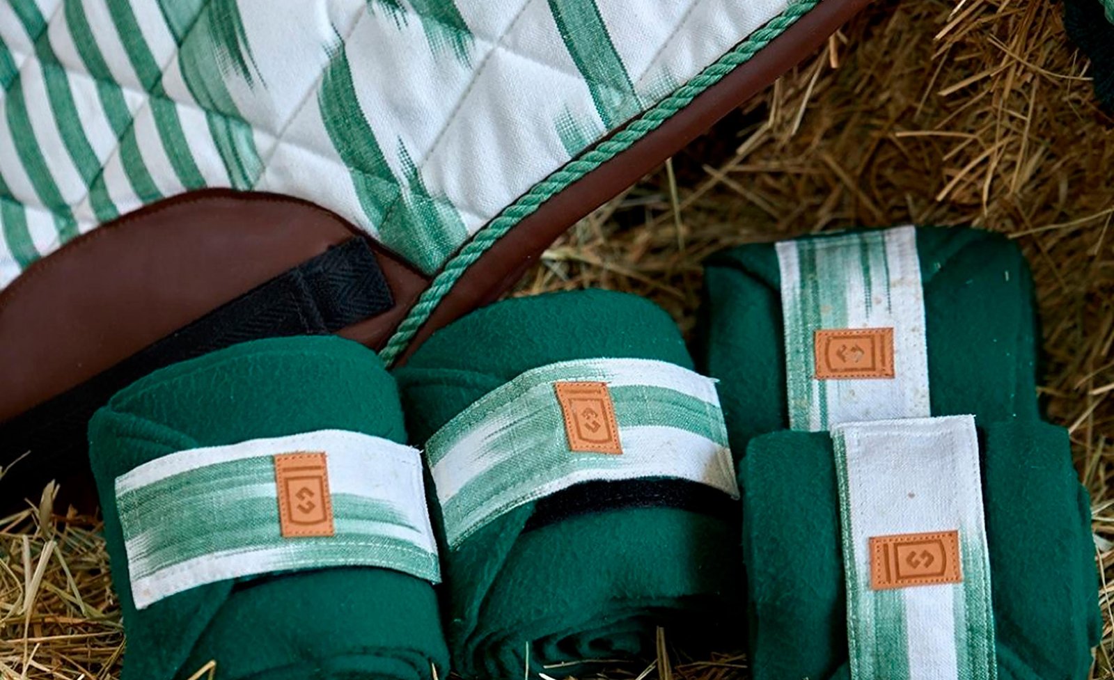 Vendas Deià en color verde, 100% poliéster, suaves y resistentes. Decoradas con detalles en tela mallorquina Ikat en la zona del velcro. Talla única: 300 cm x 12 cm.
