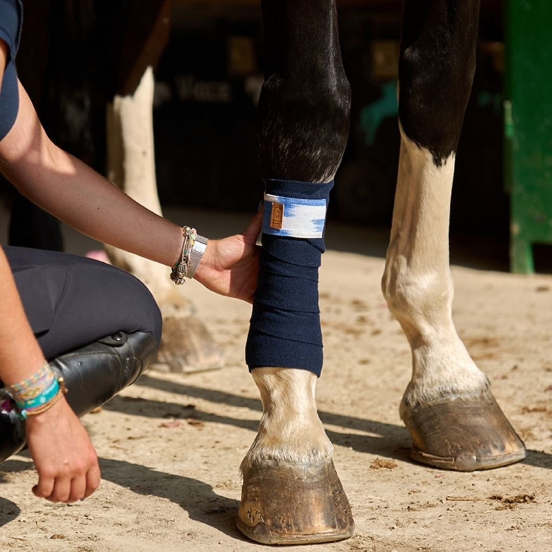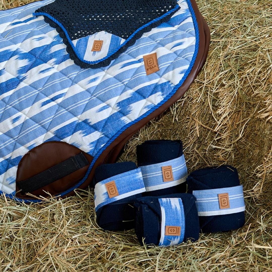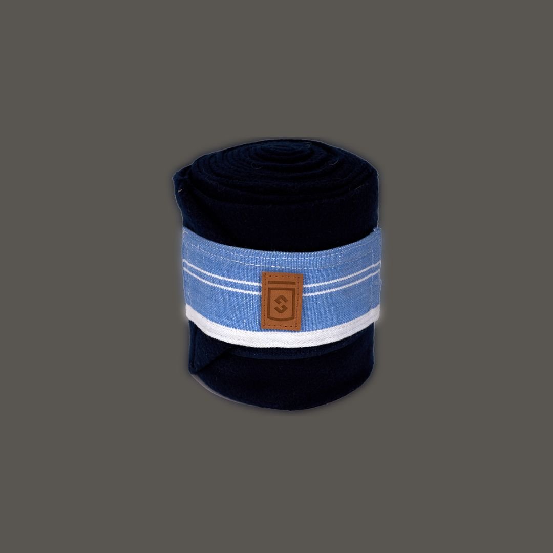 Vendas Pollença en color azul, 100% poliéster, suaves y resistentes. Decoradas con detalles en tela mallorquina Ikat en la zona del velcro. Talla única: 300 cm x 12 cm.